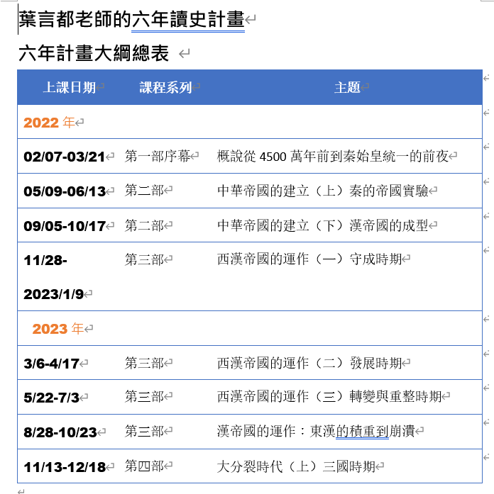 本課程自開設以來,2023年春已經完成西漢前期、中期的部分。由於《史記》僅記載到漢武帝時期,若欲繼續深入原始資料,明瞭西漢後期以下至漢帝國崩潰的歷史,就必須研讀班固撰寫的《漢書》與范曄撰寫的《後漢書》。